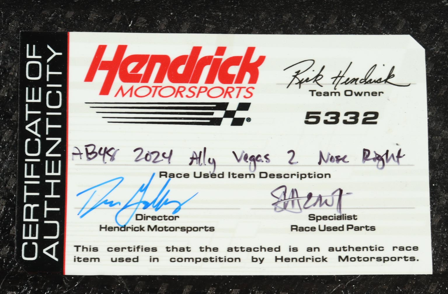 Race-Used Right Nose Car Piece from Alex Bowman's #48 Ally used during the 2024 Las Vegas Motor Speedway 2. Authenticated by the Director and Race Used Parts Specialist at Hendrick Motorsports.