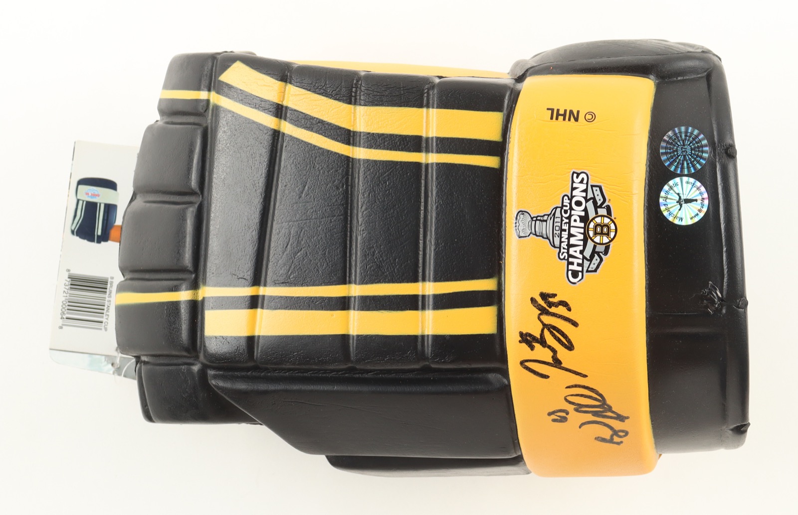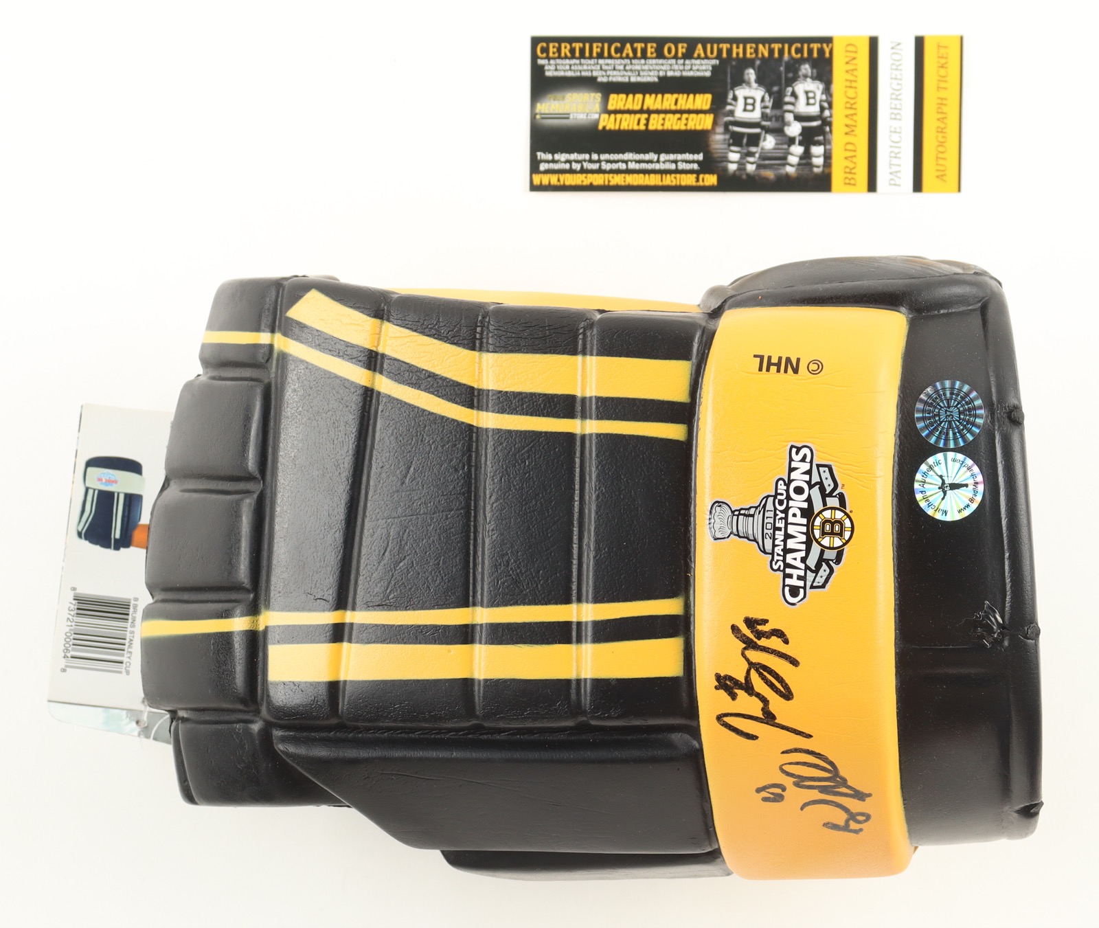 Brad Marchand & Patrice Bergeron Signed Bruins 2011 Stanley Cup Champions Logo Goalie Glove Foam Beer Holder (Marchand & Bergeron)