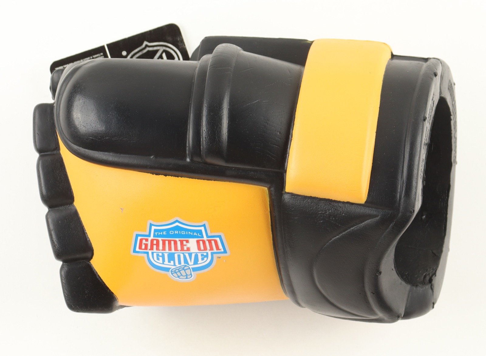 Boston Bruins commemorative goalie glove beer holder. Hand-signed by Brad Marchand and Patrice Bergeron.