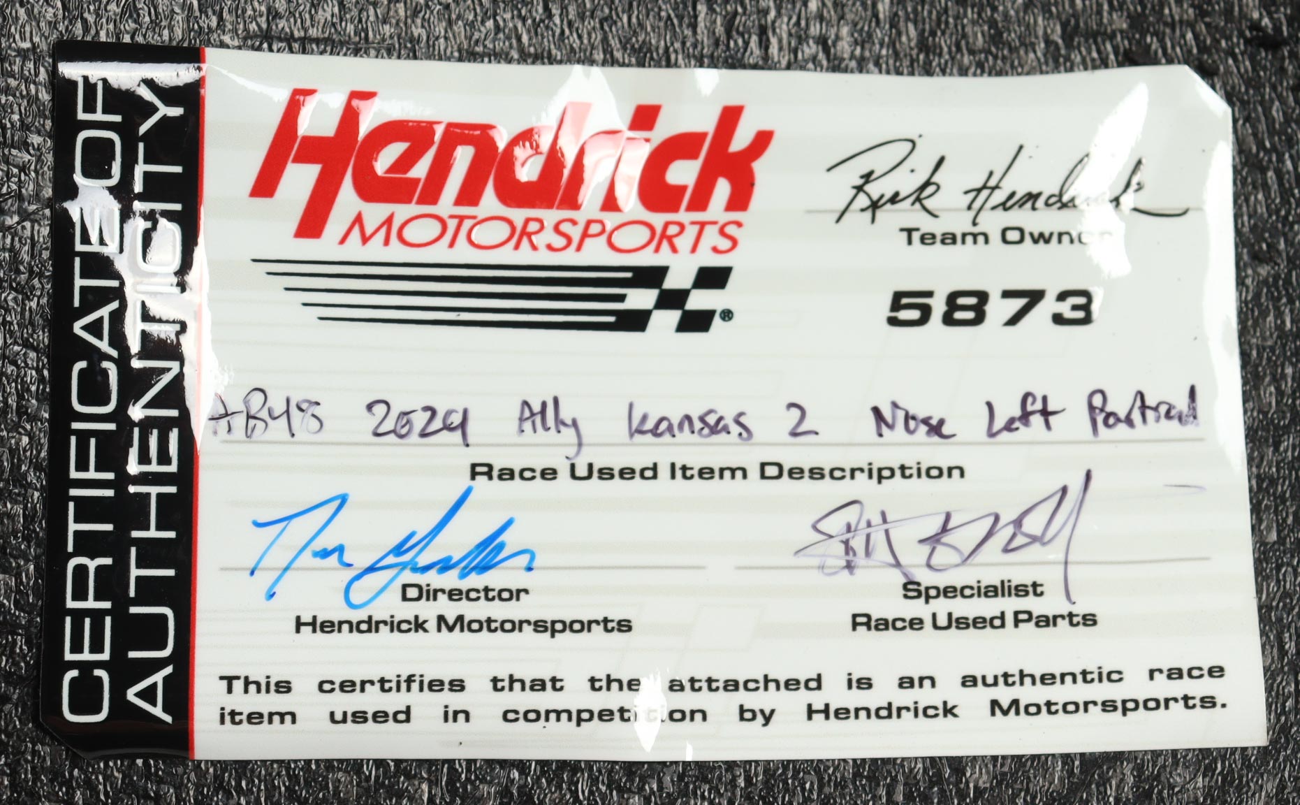 Race-Used Left Nose Car Piece from Alex Bowman's #48 Ally used during the 2024 Kansas Speedway 2. Authenticated by the Director and Race Used Parts Specialist at Hendrick Motorsports.