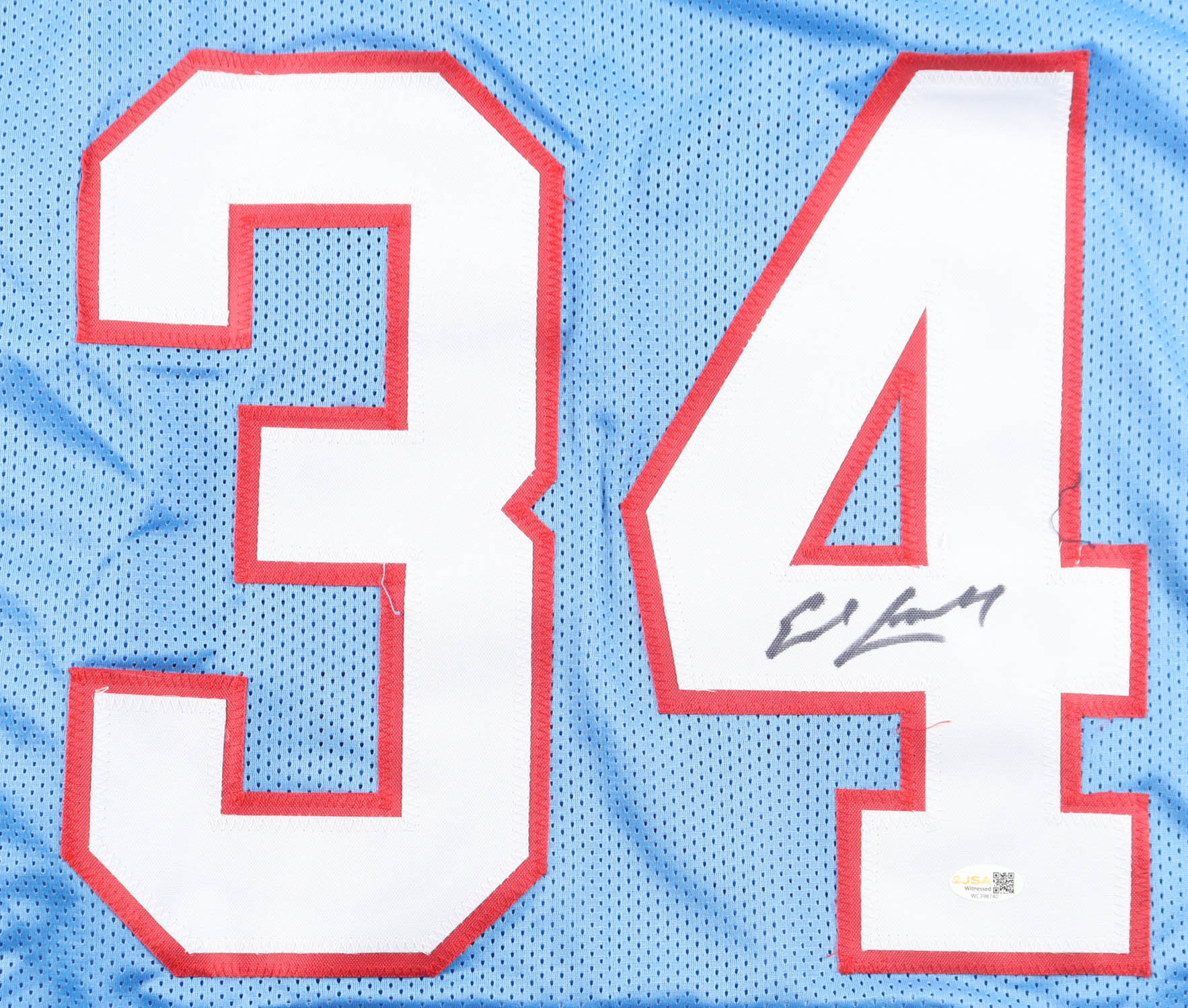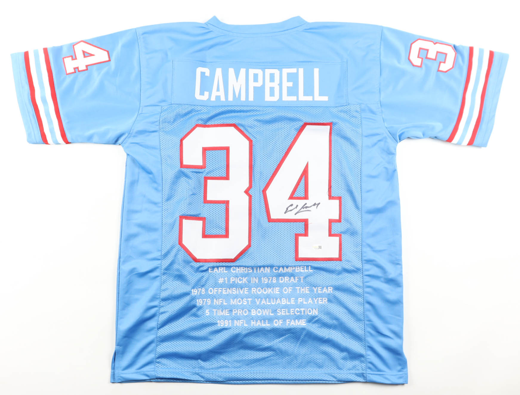 Custom jersey with everything sewn on, size XL. Hand-signed by Earl Campbell (HOF). Campbell's career highlights have been custom stitched onto the back of the jersey below the reverse numbers.