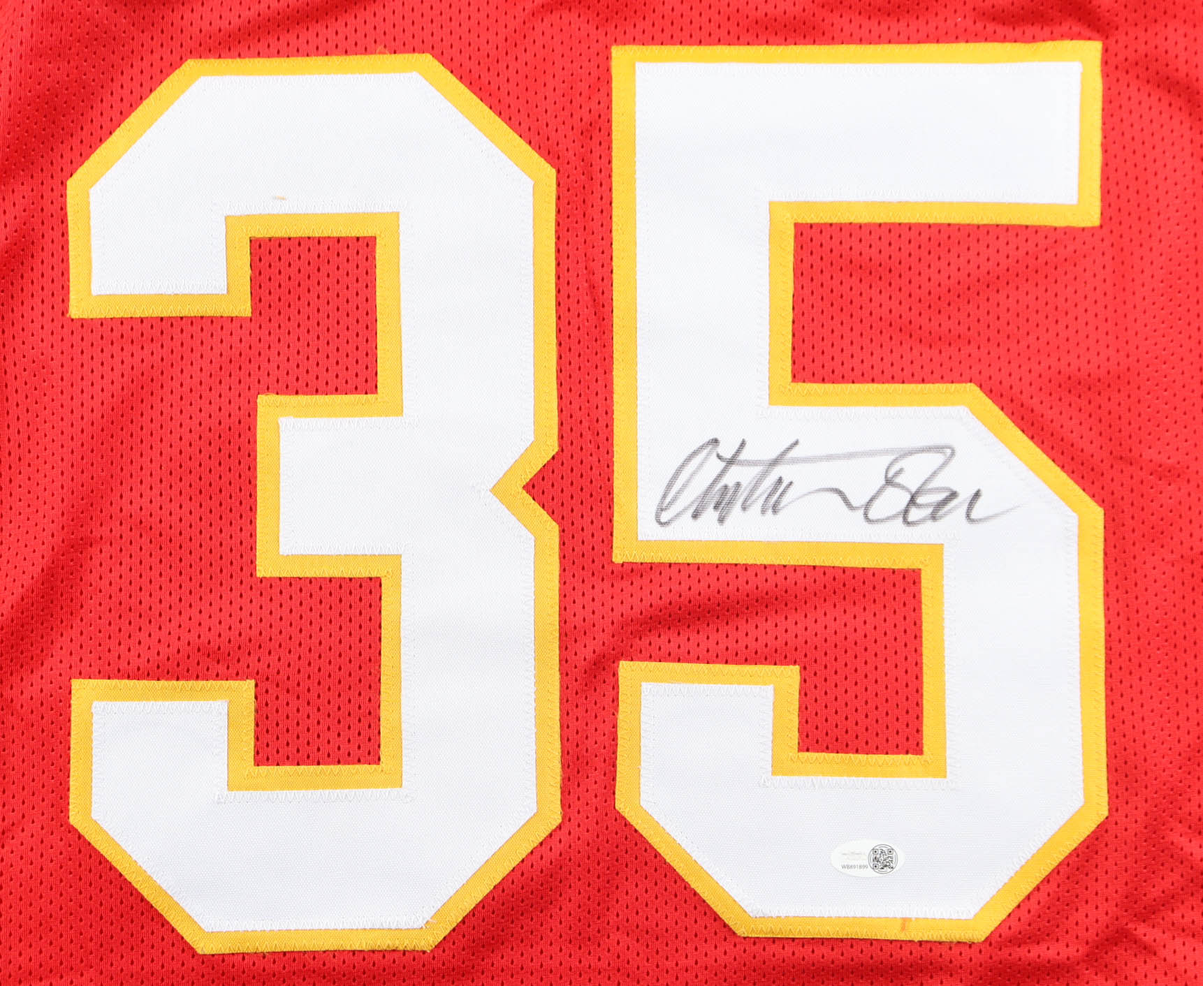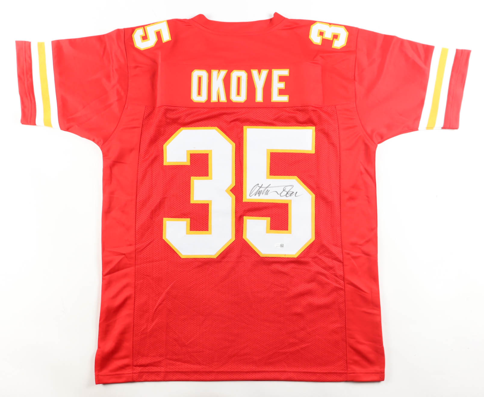 Custom jersey with everything sewn on, size XL. Hand-signed by Christian Okoye.