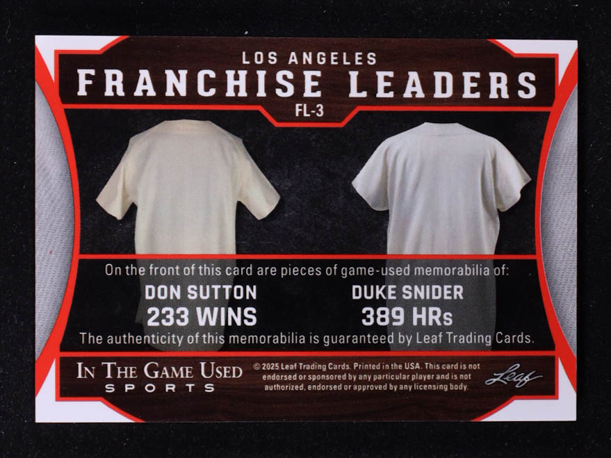 Don Sutton / Duke Snider 2025 Leaf ITG Used Sports Franchise Leaders Dual Relic Blue Foil #FL3 #15/20
