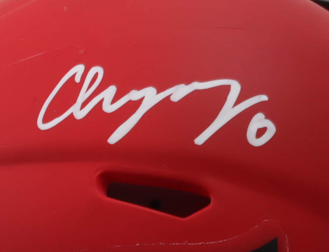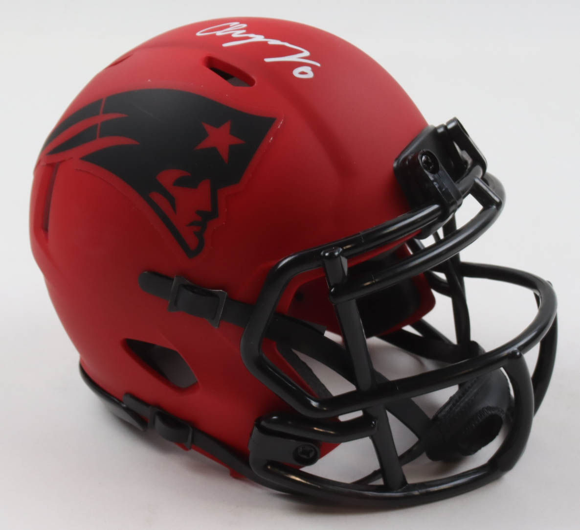 Riddell New England Patriots Rave Alternate Speed mini helmet has been hand-signed by Christian Gonzalez.