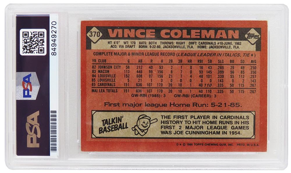 Vince Coleman Signed 1986 Topps #370 RC (PSA)