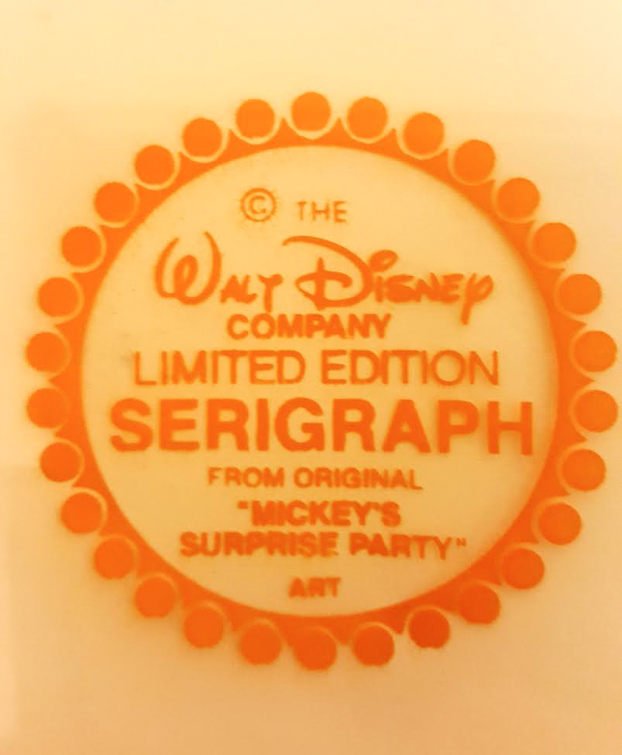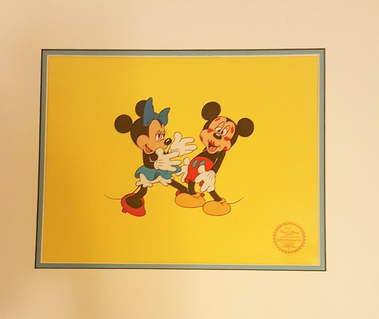 Custom Disney archival Matted Cel measures 16" x 19" in size. Minnie Loves Mickey Limited edition piece includes an official authentication seal from Walt Disney in the lower right corner. The cel was created using the original drawings and exact color from the 1939 Disney cartoon Surprise Party. This a clear cel with a colored background. Published by Circle Fine Art Corporation in 1988 for Mickey’s 60th Birthday.