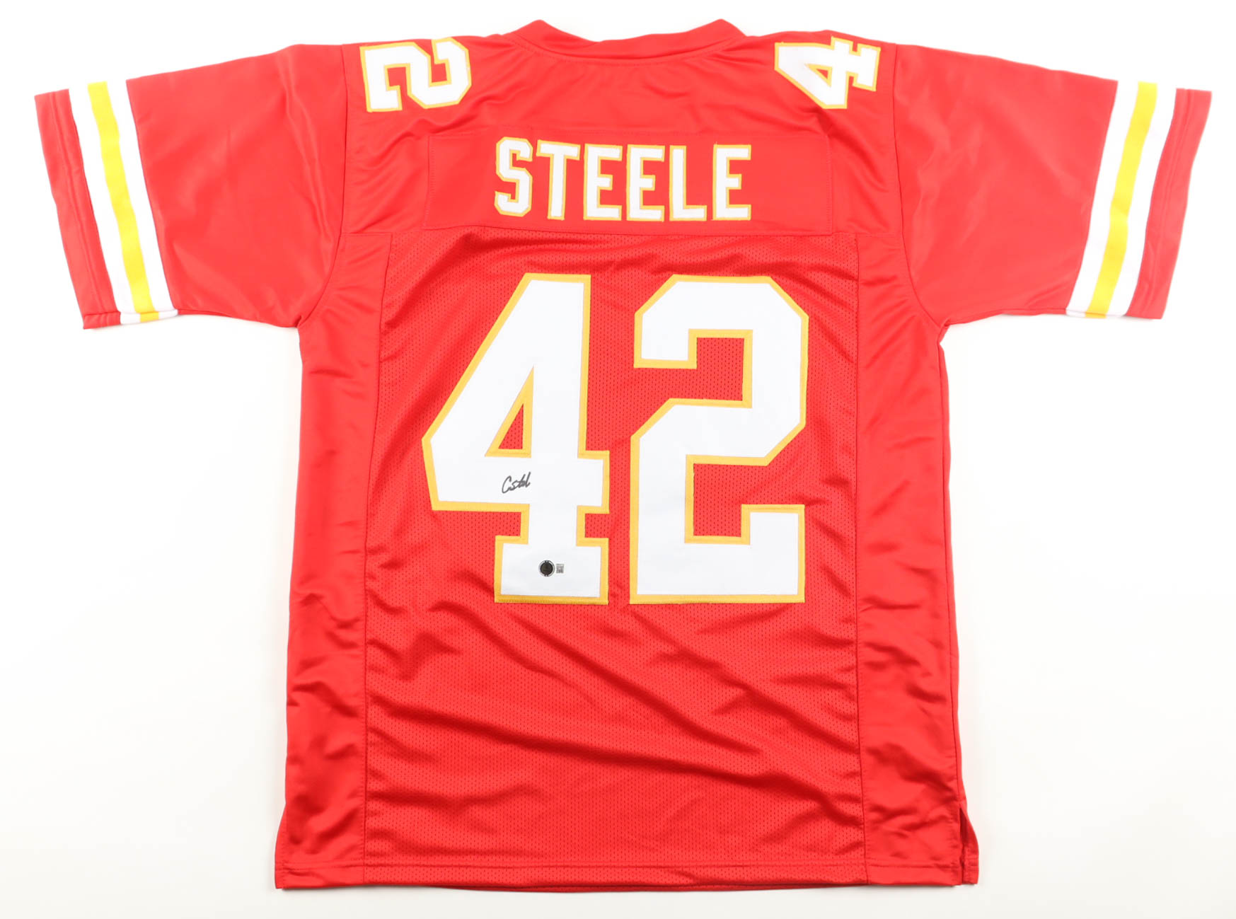 Custom jersey with everything sewn on, size XL. Hand-signed by Carson Steele. Please note, the signature has bled.