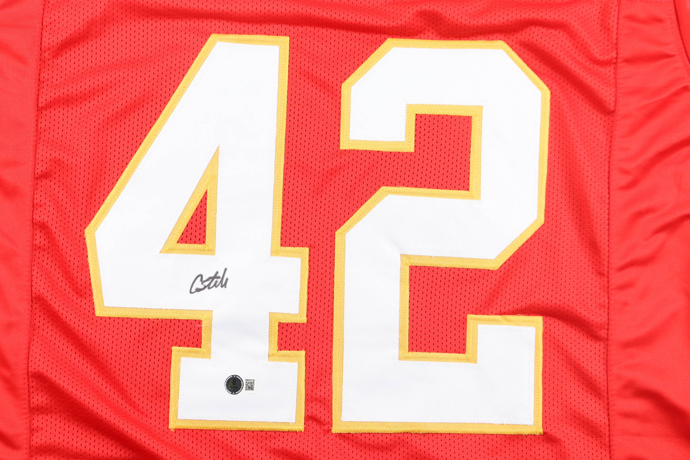 Custom jersey with everything sewn on, size XL. Hand-signed by Carson Steele. Please note, the signature has bled.