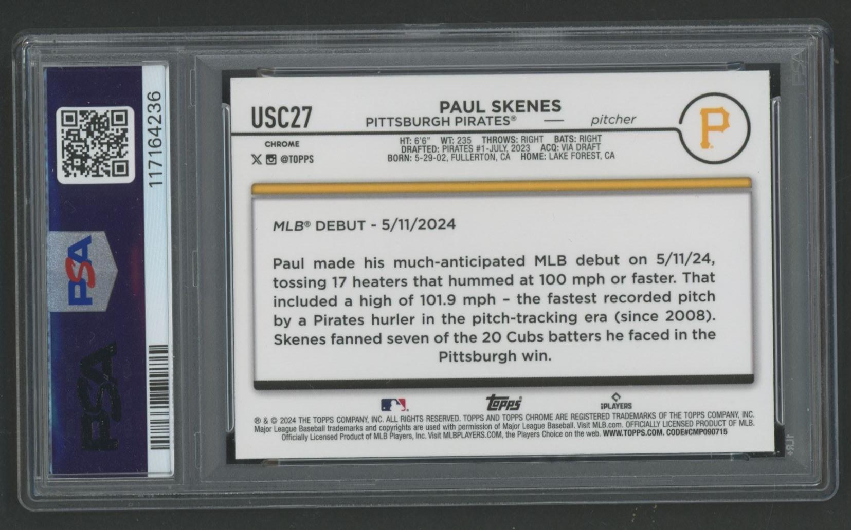 Paul Skenes 2024 Topps Chrome Update RayWave Refractors #USC27 RC (PSA 9)