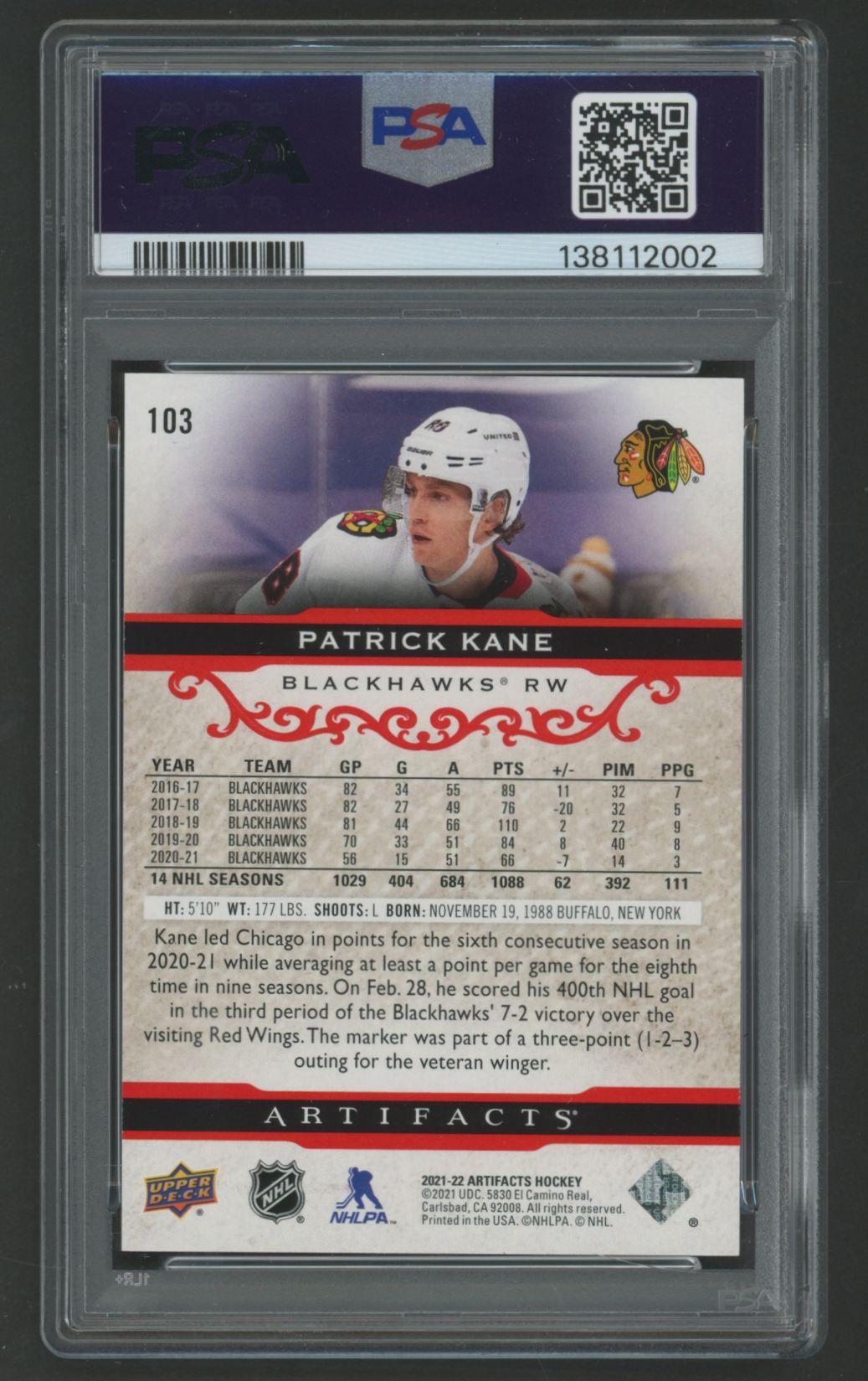 Patrick Kane 2021 Artifacts Ruby #103 #486/499 (PSA 10)