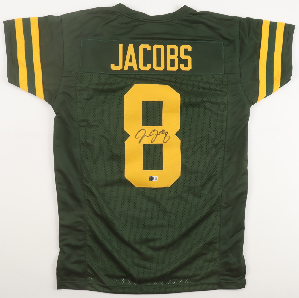 Custom jersey with everything sewn on, size XL. Hand-signed by Josh Jacobs.