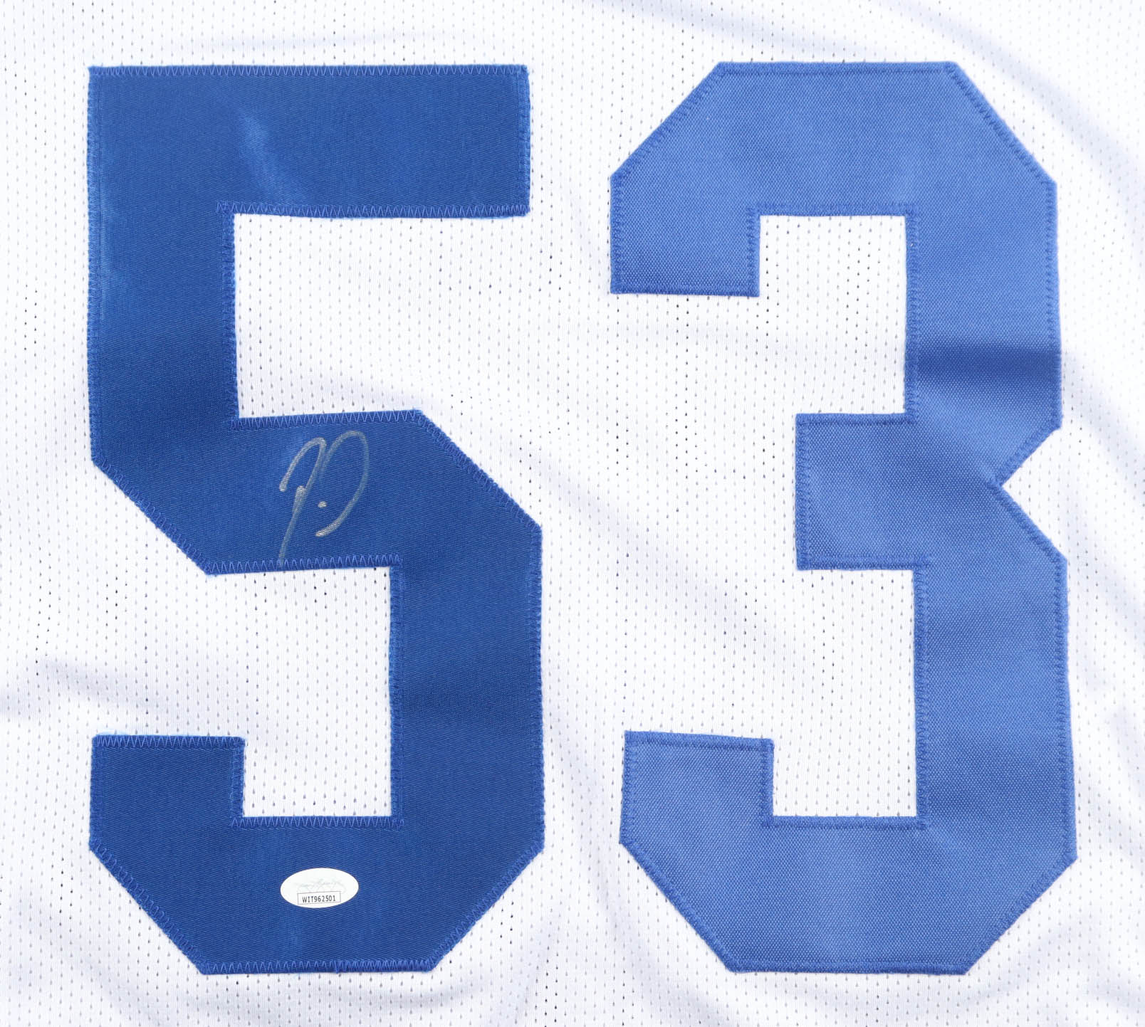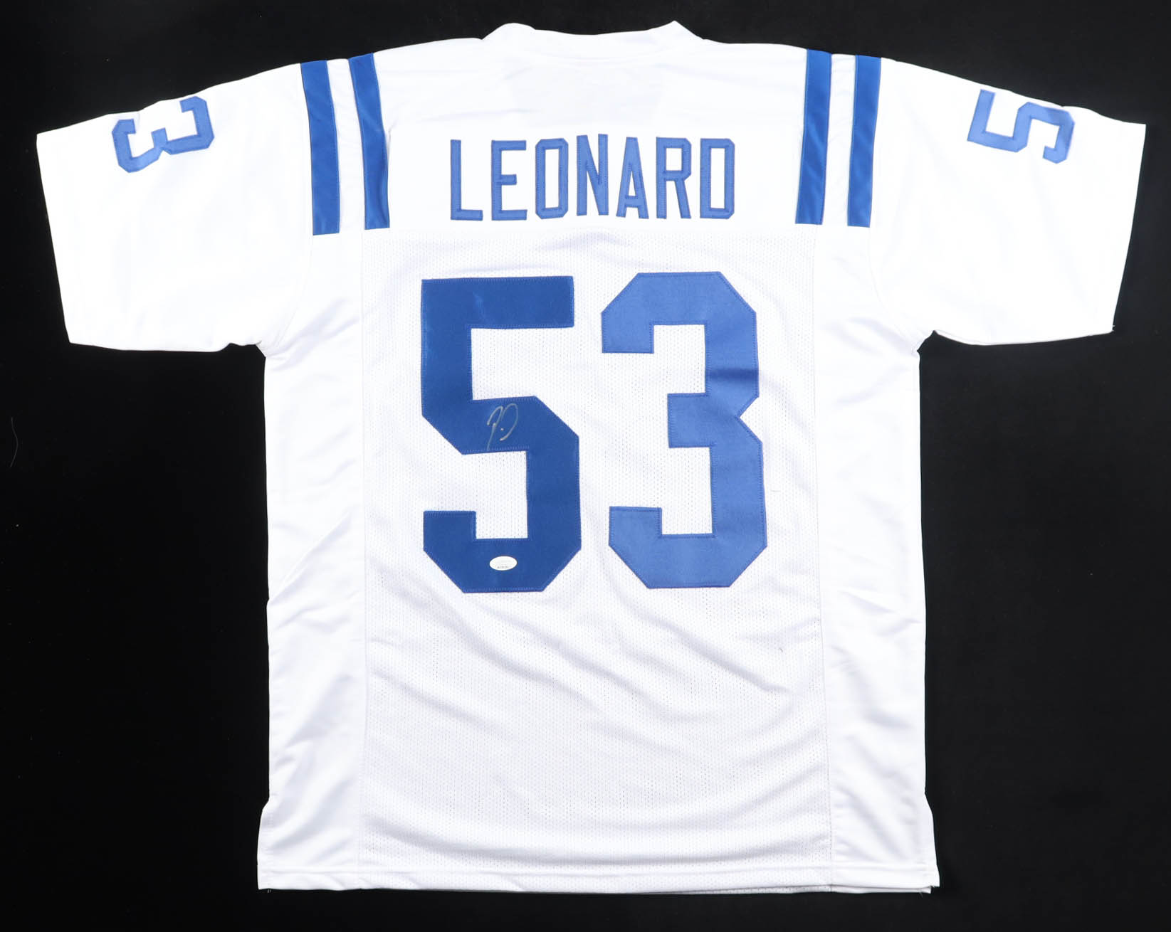 Custom jersey with everything sewn on, size XL. Hand-signed by Darius Leonard.