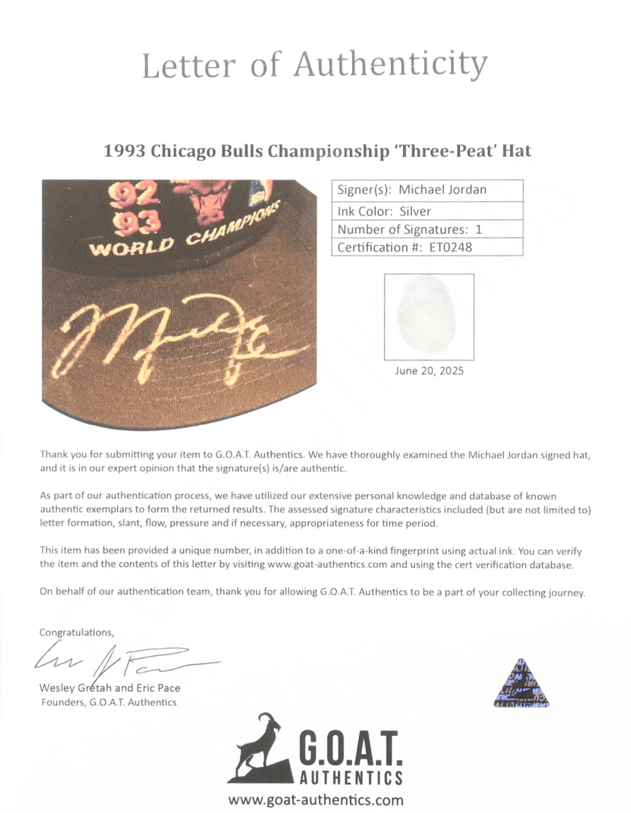 Michael Jordan Signed Bulls "Three-Peat" Adjustable Hat (GOAT)