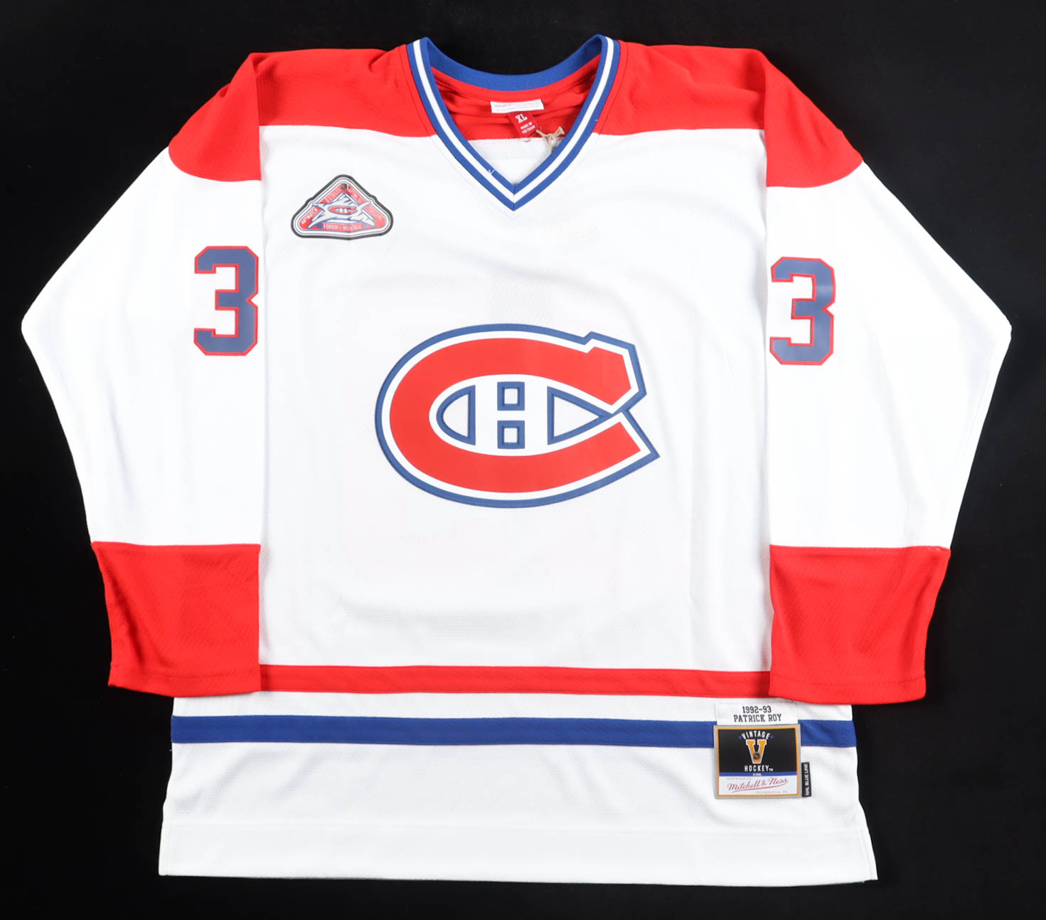 Mitchell & Ness jersey with everything sewn on, size XL. Hand-signed by Patrick Roy (Montreal Canadiens, HOF).