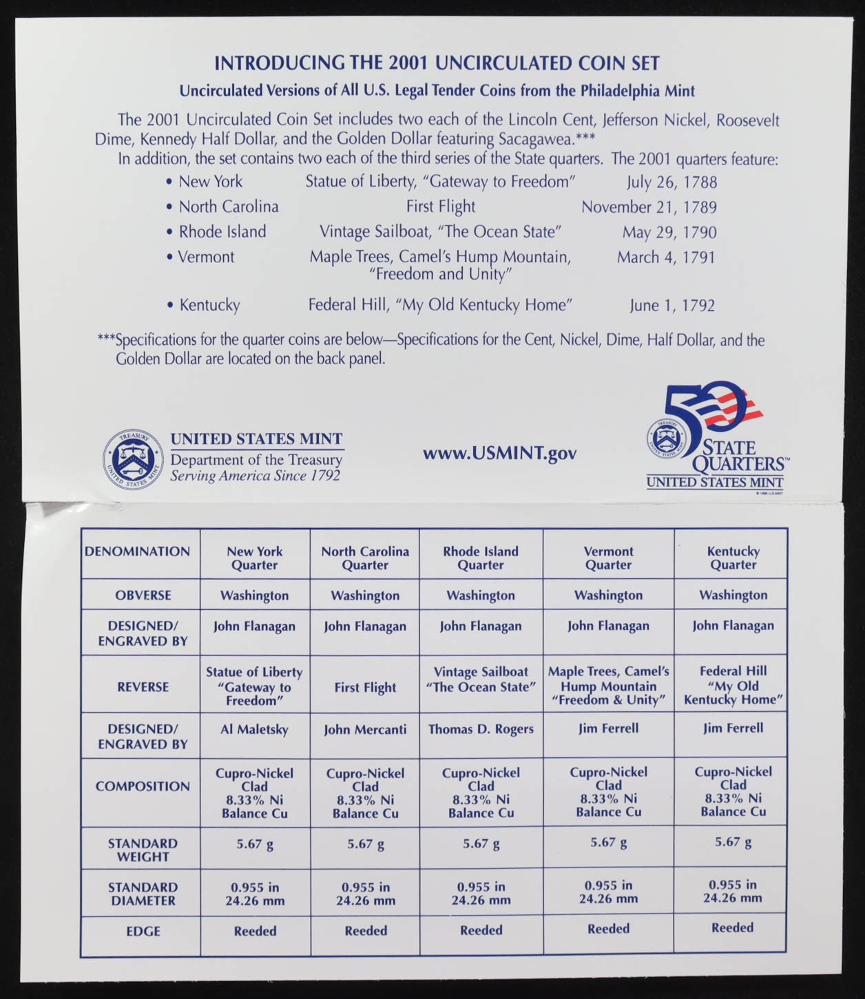 2001 Uncirculated Philadelphia Mint (10) Coin Set. Please see photos for details regarding the condition of the coin.