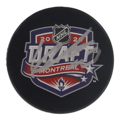 2020 NHL Draft Logo Hockey Puck. Hand-signed by Lucas Raymond (Detroit Red Wings).