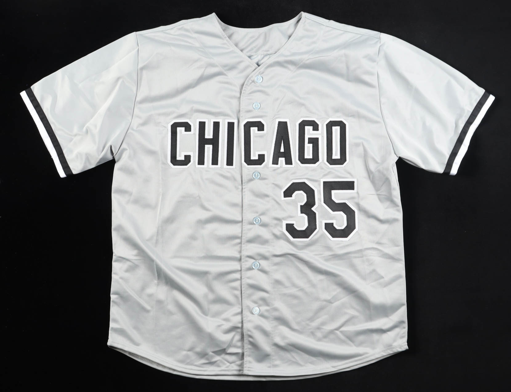 Custom jersey with everything sewn on, size XL. Hand-signed by Frank Thomas (HOF).