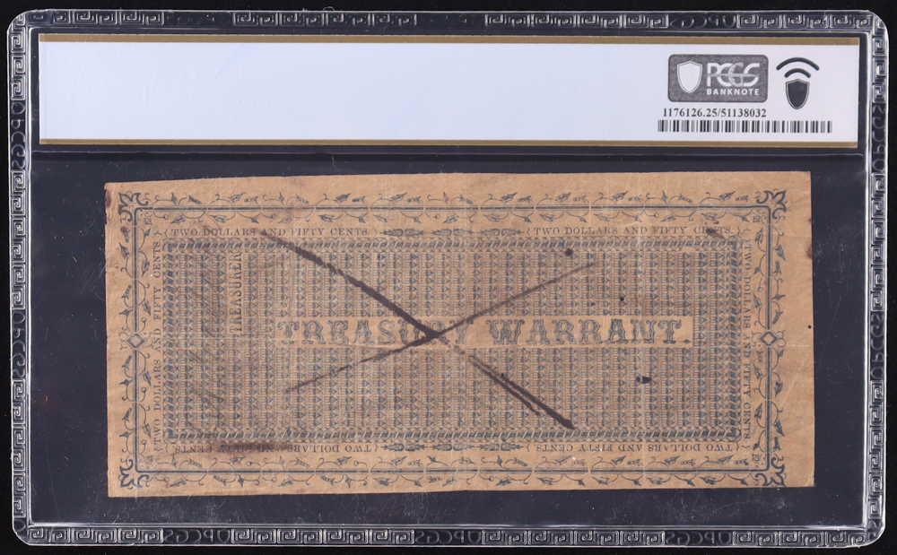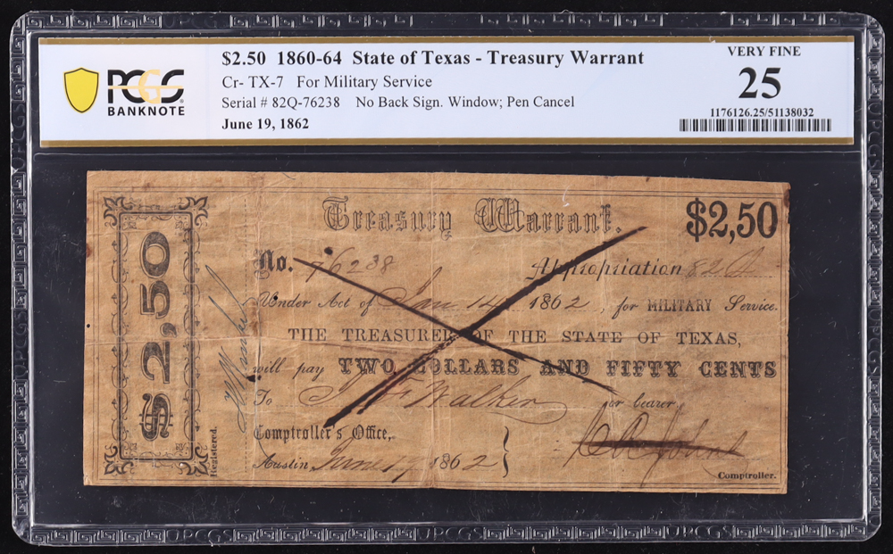 1860-64 Texas $2.50 Treasury Warrant, Military Service Cr-TX-7 (PCGS Very Fine 25)