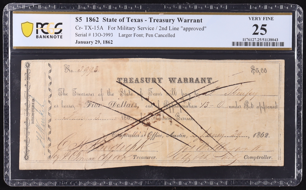 1862 Texas $2.50 Treasury Warrant, Military Service Cr-TX-15A (PCGS Very Fine 25)