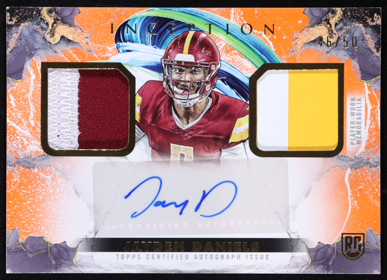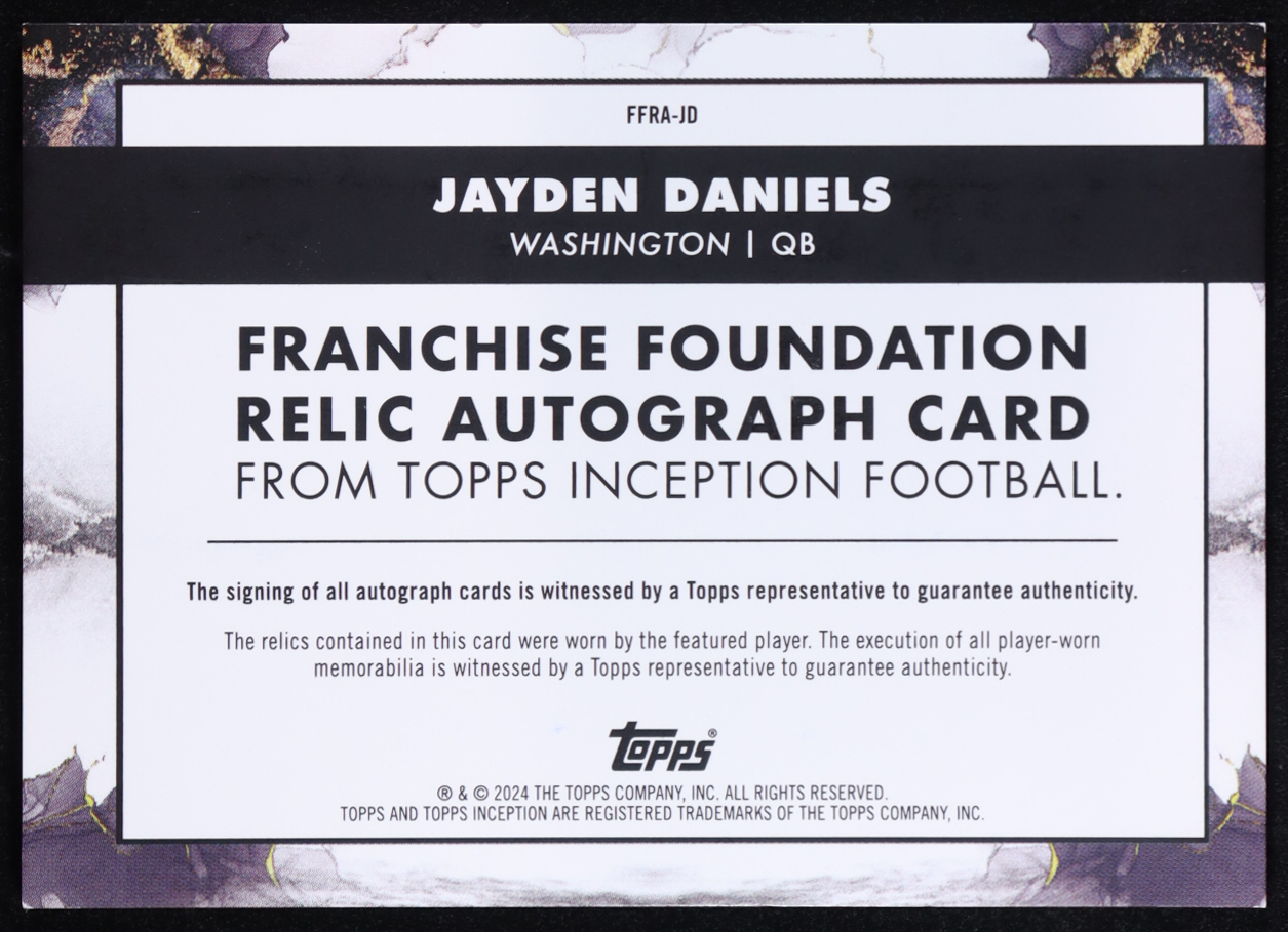 Jayden Daniels 2024 Topps Inception Franchise Foundation Relic Autographs Orange #FFRAJD #46/50 RC