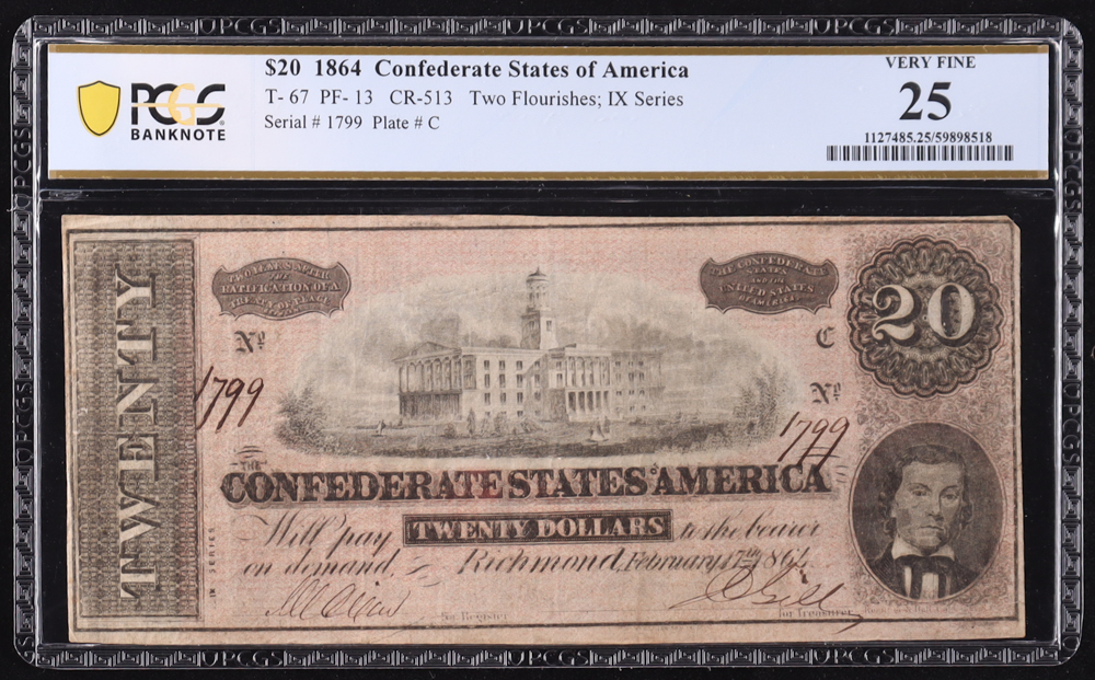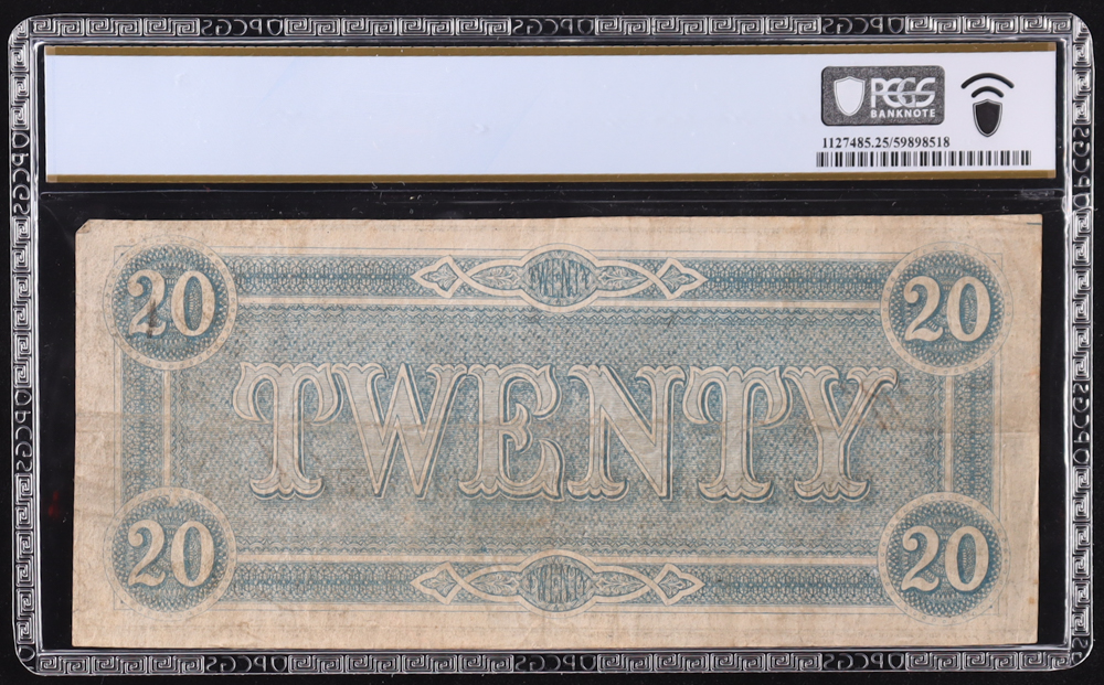 1864 Confederate $20 Currency Note, T-67 w/ Two Flourishes (PCGS Very Fine 25)