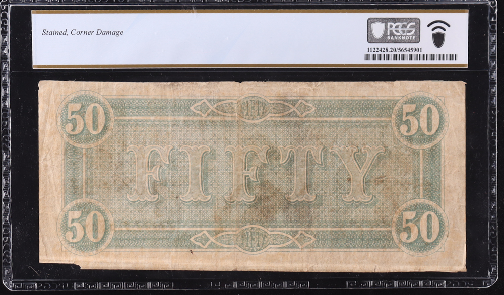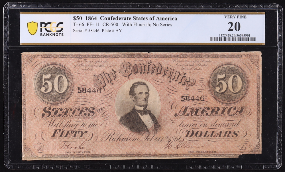 1864 Confederate $50 Currency Note, T-66 CR-500 w/ Flourish; No Series (PCGS Very Fine 20)