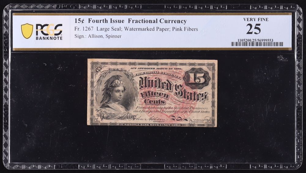 1863 U.S. 15¢ Fractional Currency Note, 4th Issue - Fr. 1267 Large Seal - Signed: Allison / Spinner (PCGS Very Fine 25)