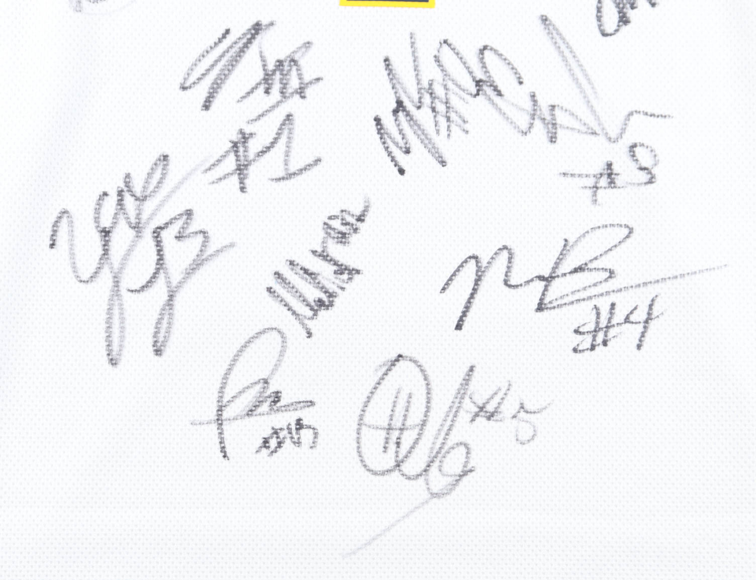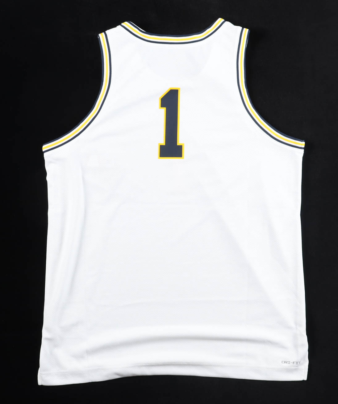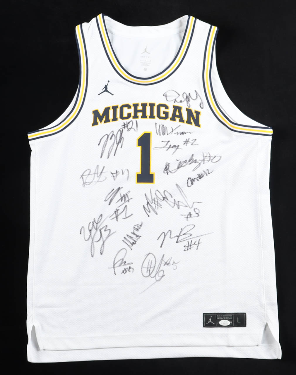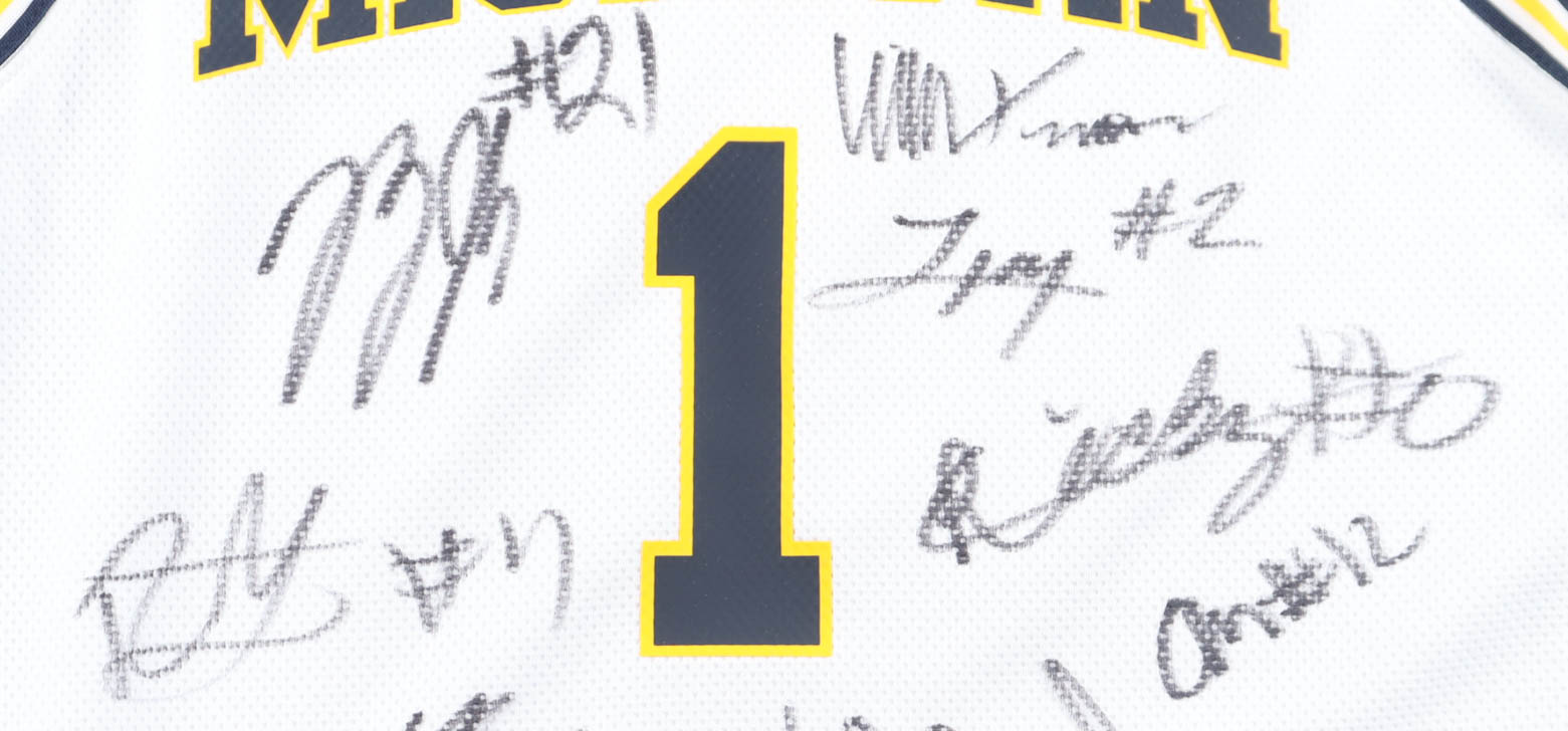 Jordan authentic jersey with everything pressed on, size M. Hand-signed by (15) with Dusty May, Yaxel Lendeborg, Morez Johnson Jr., Aday Mara, Nimari Burnett, Elliot Cadeau, LJ Cason, Trey McKenney, Will Tschetter, Roddy Gayle Jr., Charlie May, Malick Kordel, Ricky Liburd, Oscar Goodman, and Winters Grady.