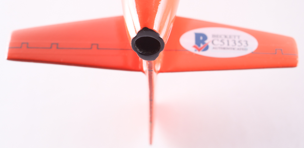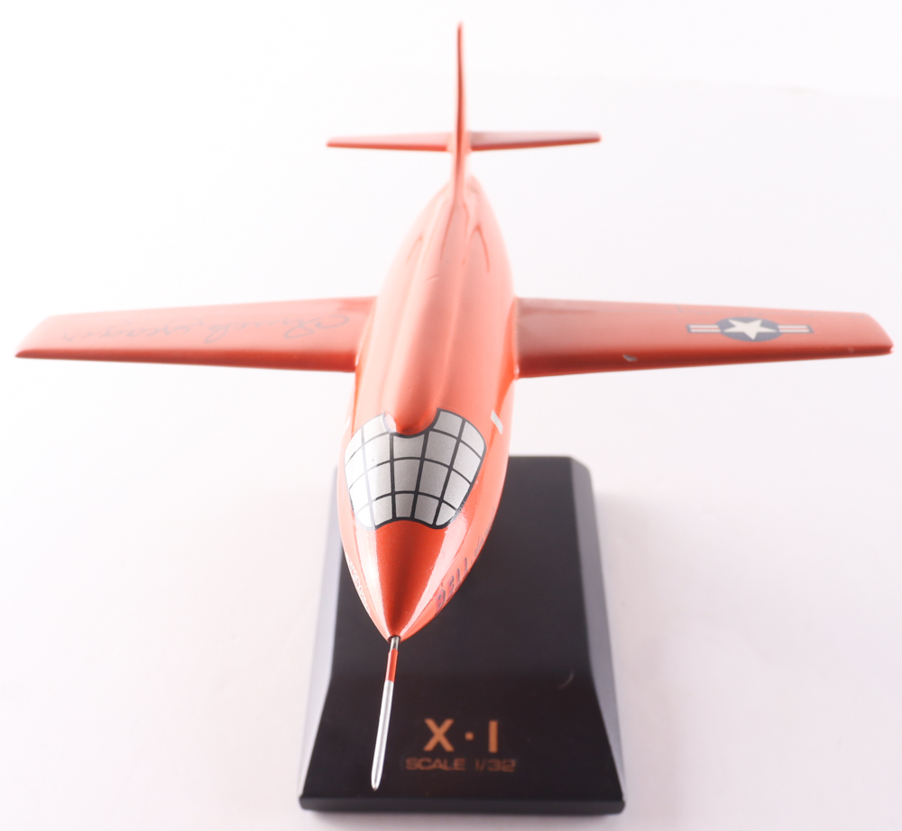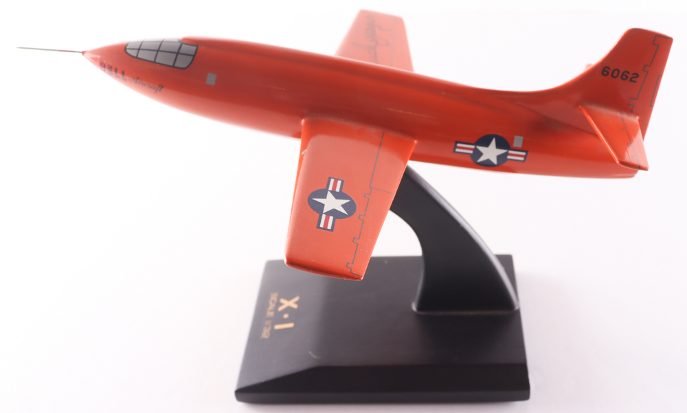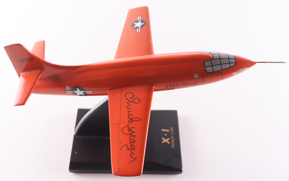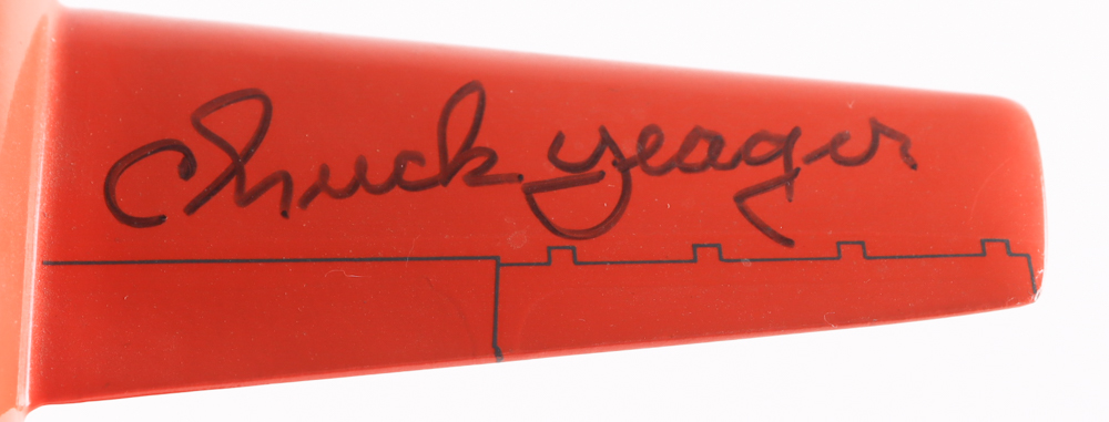 Wooden model measures approximately 11.5" in length and comes with a stand as shown. Hand-signed by Chuck Yeager (d. 2020).