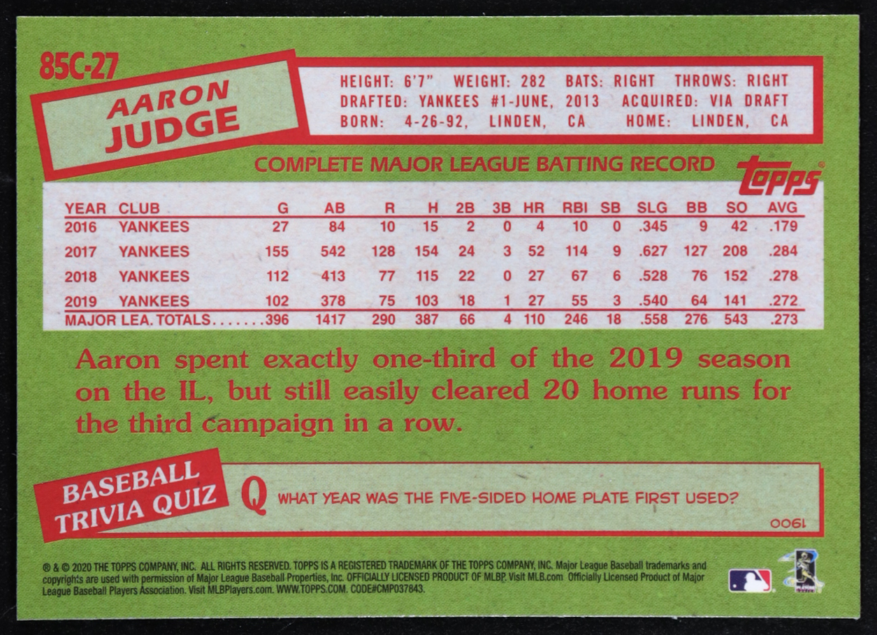 Aaron Judge 2020 Topps '85 Topps Silver Pack Chrome #85C27