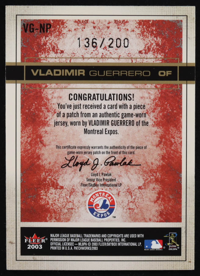Vladimir Guerrero 2003 Fleer Patchworks National Patchtime Trim Game-Worn #VG #136/200