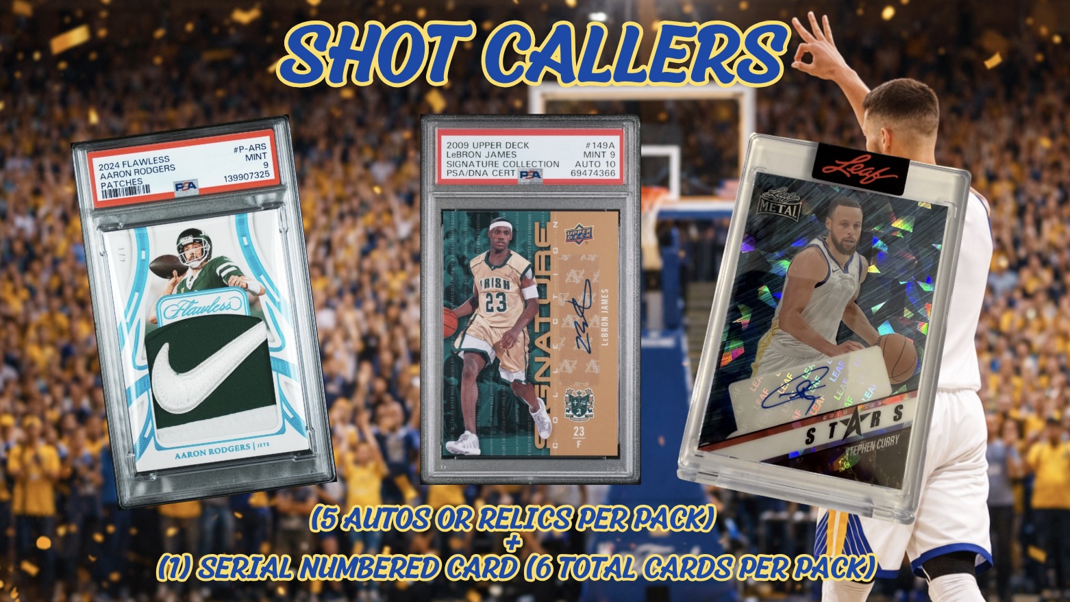 The chase is on. Break King: Shot Callers laces up and hits the hardwood with serious swagger, delivering a high-energy ripping experience built for true hit chasers. Every pack is absolutely LOADED delivering six guaranteed total cards, five certified autograph and/or relic hits, including a non signed serial-numbered card,featuring a stacked lineup of icons, superstars, and rising phenoms from football, basketball, baseball, and beyond—making every single rip a shot at something legendary. All major manufacturers are represented — including Topps, Panini, Upper Deck, Leaf, and more — turning every pack into a true treasure hunt. With completely randomized assortments, no two openings are ever the same.
