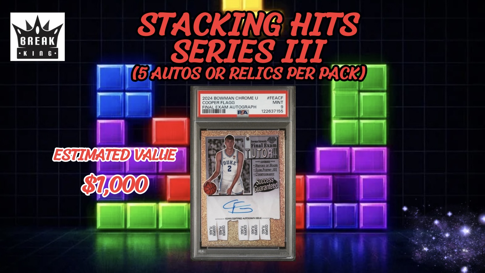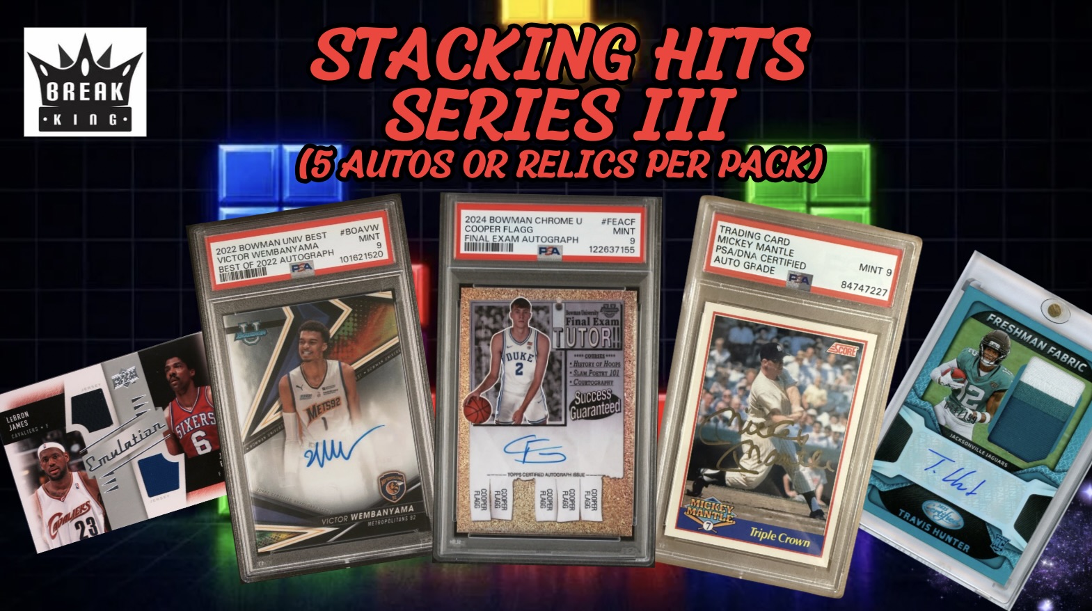 Break King: Stacking Hits Series III is back with a vengeance, delivering an adrenaline-packed ripping experience built for true hit chasers. Every pack features five certified autograph and/or relic cards showcasing stars from football, basketball, baseball,