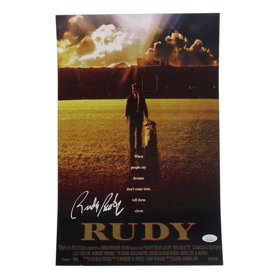 Movie poster measures 11” x 17” in size and has been hand-signed by Rudy Ruettiger.