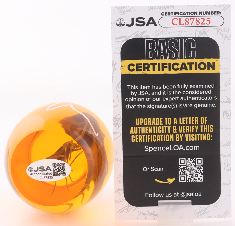 Jurassic Park Replica Prop Mosquito In Amber measures approximately 3" in height. Hand-signed by Jeff Goldblum.