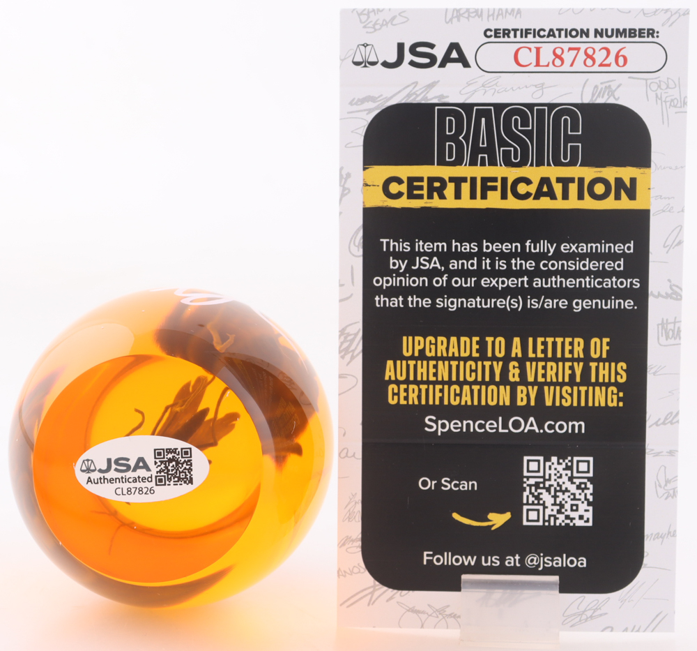 Jurassic Park Replica Prop Mosquito In Amber measures approximately 3" in height. Hand-signed by Jeff Goldblum.