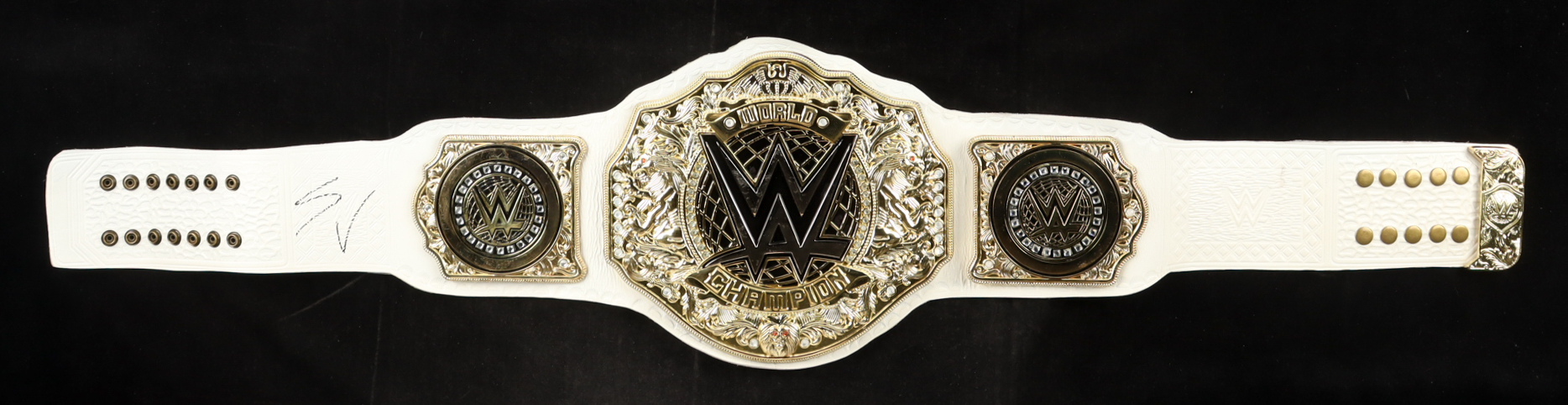 WWE Women's World championship replica belt measures approximately 47" in length and has been hand-signed Stephanie Vaquer. See photos for more details on condition of signature and belt.