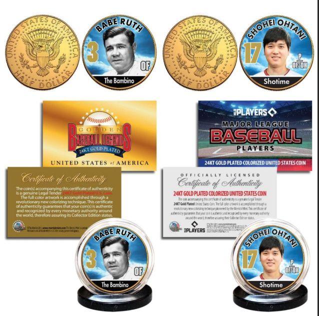 Shohei Ohtani & Babe Ruth Set of (2) 24K Gold Plated US JFK Half Dollar Coins
