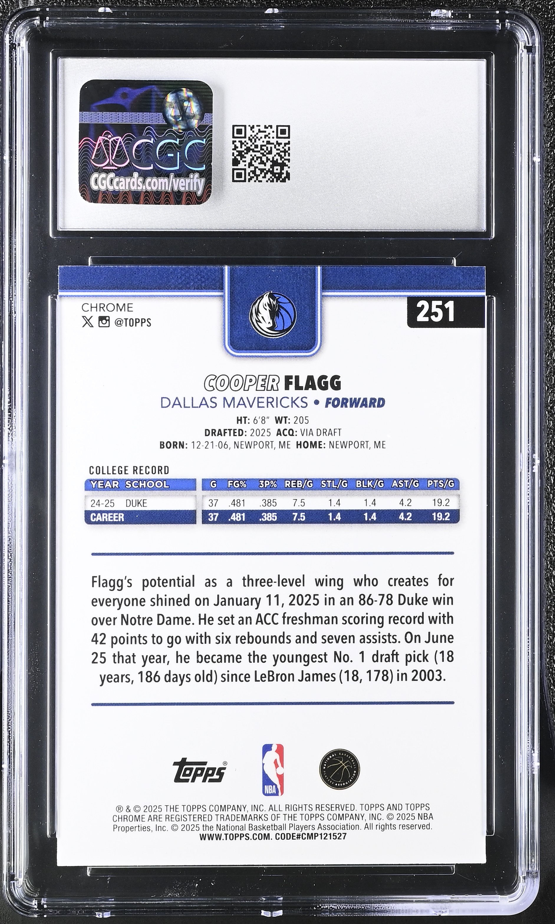 Cooper Flagg 2025-26 Topps Chrome #251 RC (CGC 8.5)