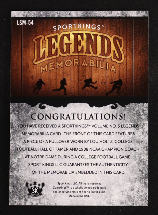 Lou Holtz 2022 Sport Kings Volume No.3 Legends Game Worn Memorabilia #LSM-54