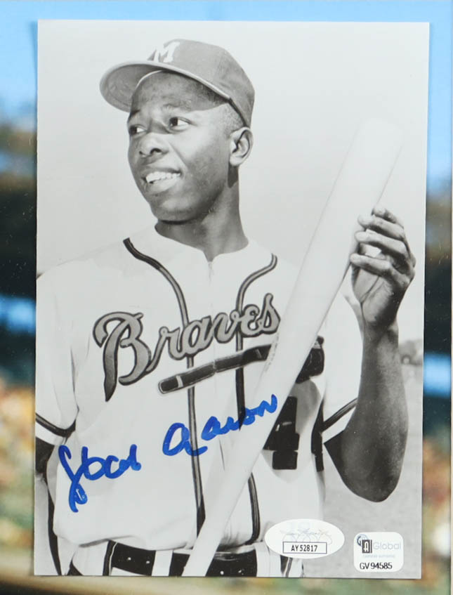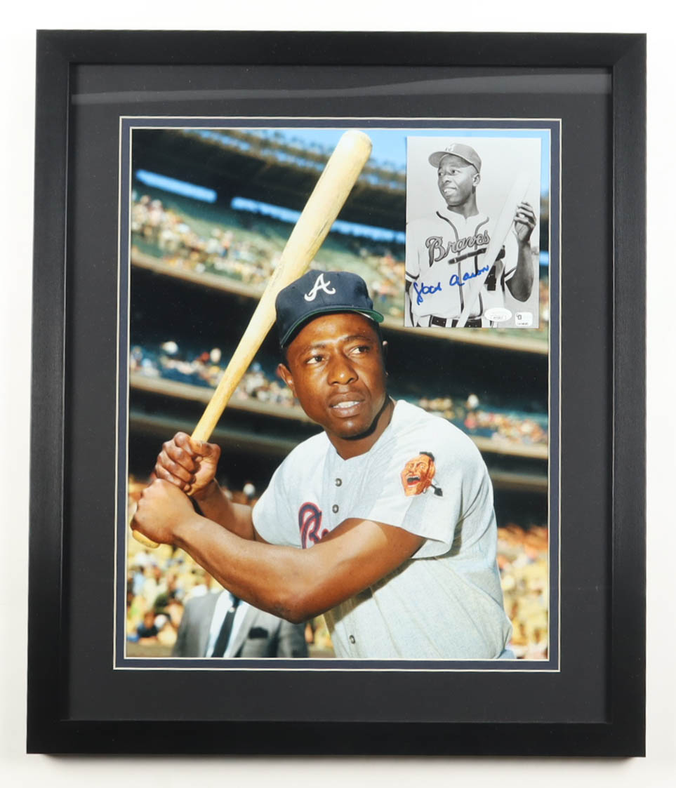 Custom frame measures 22" x 26" in size. Photograph is hand-signed by Hank Aaron (Atlanta Braves, HOF).