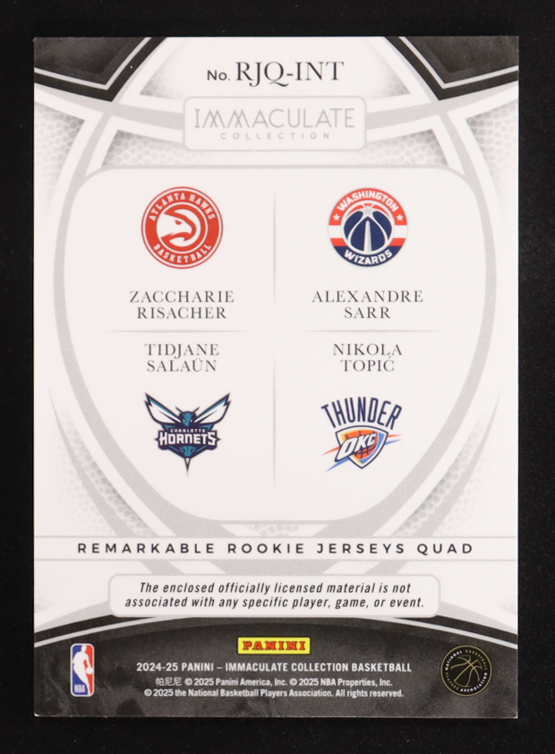 2024-25 Immaculate Collection Remarkable Rookie Jerseys Quad Blue #7 Zaccharie Risacher / Alexandre Sarr / Nikola Topic / Tidjane Salaun #07/10 RC