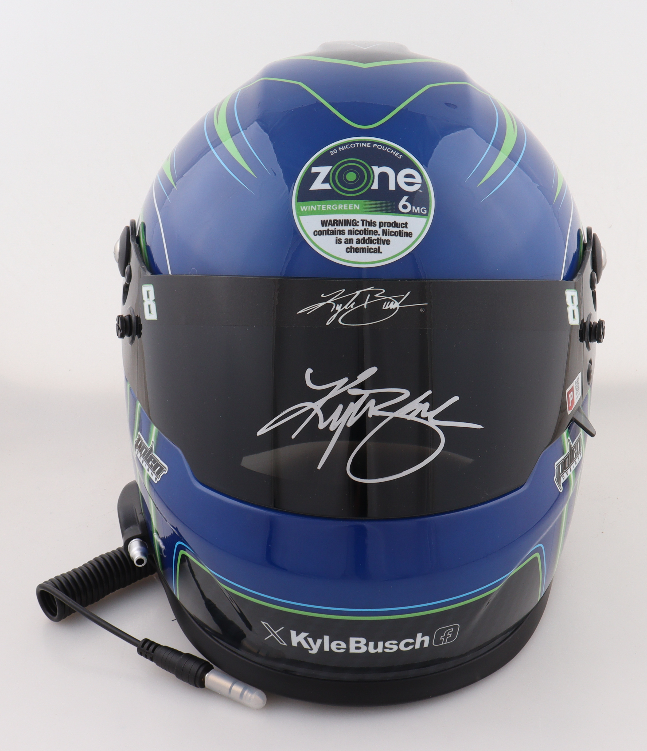Full-size special edition replica NASCAR helmet has been hand-signed on the visor by Kyle Busch.