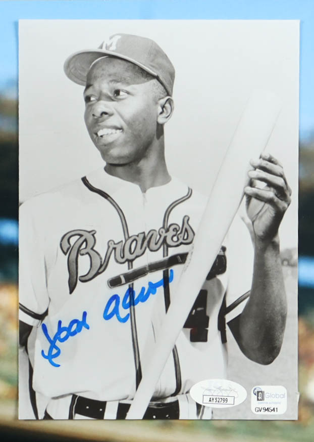 Custom frame measures 22" x 26" in size. Photograph is hand-signed by Hank Aaron (Atlanta Braves, HOF).