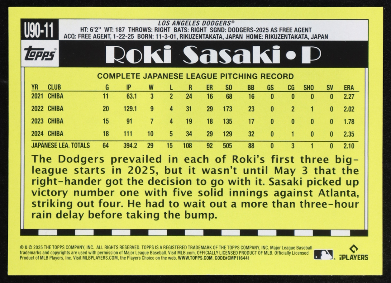 Roki Sasaki 2025 Topps Update '90 Topps #U9011 RC