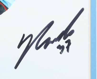 Custom frame measures approximately 13.5" x 16.5" in size and features a photo that has been hand-signed by Yanni Gourde.