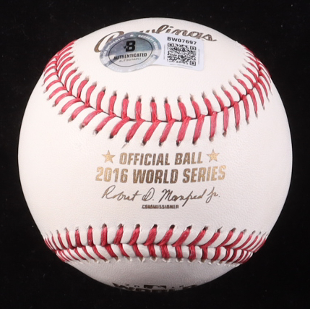 Rawlings Official 2016 World Series logo baseball. Hand-signed by Kyle Hendricks (Chicago Cubs). Please note, the signature and inscription are smudged.