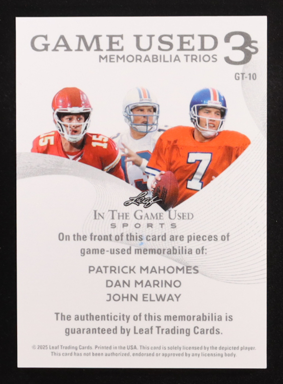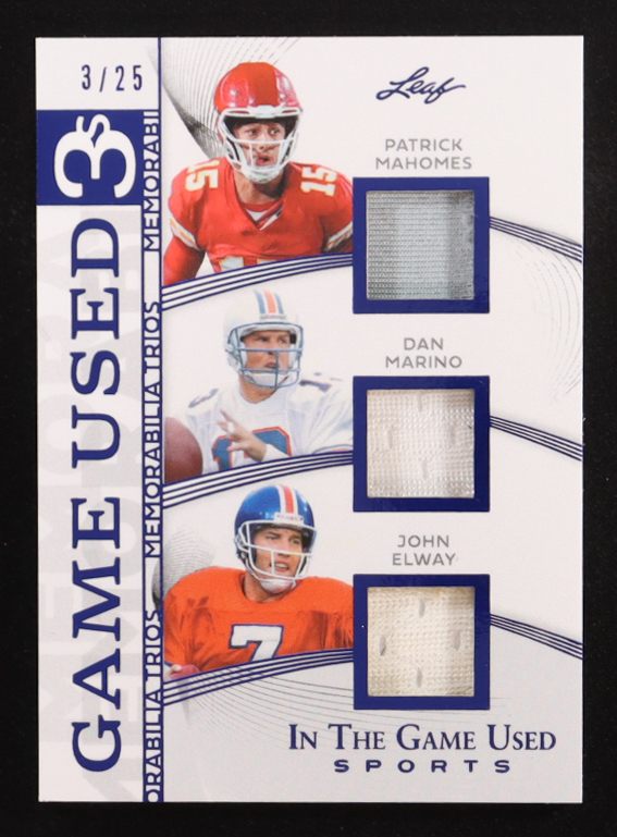 Patrick Mahomes / Dan Marino / John Elway 2025 Leaf In The Game Used Sports Memorabilia Trios Blue #GT10 #3/25