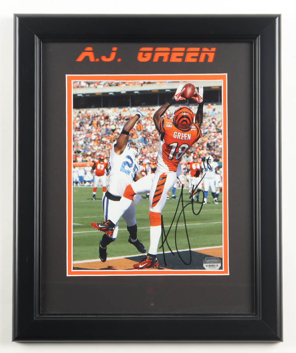 Custom frame measures approximately 13.5" x 16.5" in size and features a photo that has been hand-signed by A.J. Green (Cincinnati Bengals).