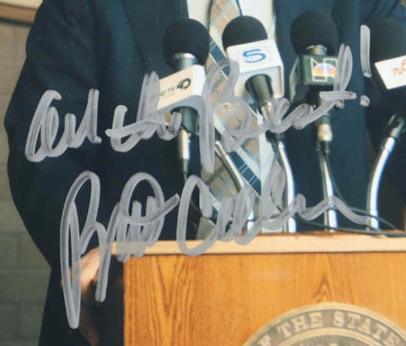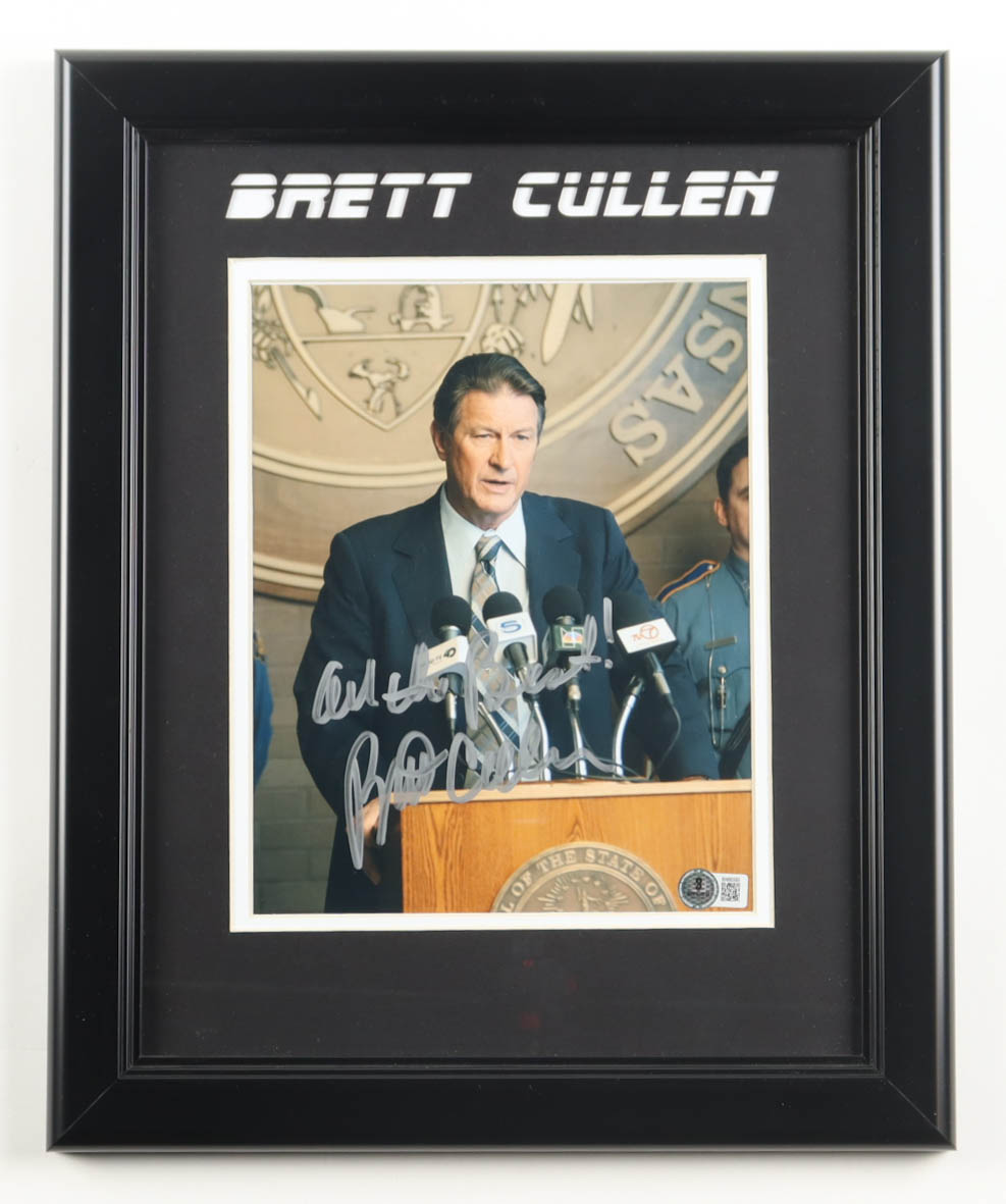 Custom frame measures approximately 13.5" x 16.5" in size and features a photo that has been hand-signed and inscribed by Brett Cullen.